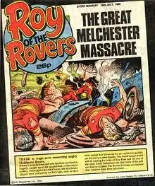 The story followed Roy Race, a striker for the fictional football team Melchester Rovers, based in a town of the same name in an unspecified part of England, where Roy lived with his family. In the first episode, a teenaged Roy and his best friend, Blackie Gray, signed for the Rovers after being spotted playing for a youth club team.[19][20] Eight months later, Roy and Blackie made their first-team debuts against Elbury Wanderers in a game that ended in a 3–3 draw, with Roy scoring twice.[21][22] He soon became a star, leading the team to either the Football League title or a cup almost every season. In January 1975 he was made player-manager,[23] a position he retained for most of the next 20 years. Although the strip followed the Rovers through nearly 40 seasons, Roy did not age at the same rate and appeared to be at most in his late thirties by the time the weekly comic ended. This unrealistic longevity was never remarked upon by the weekly comic, although the monthly comic attempted to address the anomaly by explaining that more than one Roy Race had played for Melchester over the years.[lower-alpha 3]