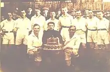 In autumn of 1920 Ruch won the promotion to the nascent Silesian Klasa A (see also: Lower Level Football Leagues in Interwar Poland). The Blues were third out of fourteen teams in its first season, unfinished due to the third Silesian Uprising. The next year Ruch won the championship of the Silesian Klasa A and represented the region in the 1922 Polish Football Championship. In 1924 the club finished second in the regional top league, behind AKS Królewska Huta, before 1924 considered German and known as Verein für Rasenspiele Königshütte, the first team Ruch had developed a local rivalry with. In 1925 the Silesian Klasa A did not play, instead Stanisław Flieger's Cup took place, ultimately won by Ruch, which gave the side a start in the only interwar Polish Cup competition in 1926. On 4 July 1926 Józef Sobota, before 1920 a BBC's player, became the first Ruch's player (and the fourth from Upper Silesia) of the Polish National Team, who also scored a goal (against Estonia). In the same year, two weeks after the national Cup Ruch won for the second time the regional Klasa A, firmly establishing itself as one of the strongest football clubs in this densely populated region and as such it was among the founding clubs of the Polish national league in 1927. In 1933 Ruch won its first Championship as the first side from Silesia, with all the players who were born not further as a few kilometers from the na Kalinie pitch.[6] Thus the first truly golden era began. The local steel mill (since 1934 known as Huta Batory) began to financially support the side. In the winter of 1933 the most noteworthy players such as Edmund Giemsa, Teodor Peterek and Gerard Wodarz were joined by legendary Ernst Wilimowski, bought from 1. FC Kattowitz, who with Peterek and Wodarz were collectively nicknamed the three kings and helped to win another 4 championships (1934, 1935, 1936, 1938). On 1 November 1934 the club, as the last in the league, employed its first coach, Gustav Wieser.[7] The side was also a leader in the unfinished season 1939. The successes rendered the club the most popular in the voivodeship and accelerated building of the new stadium in the years 1934-1935, the current Stadion Miejski.