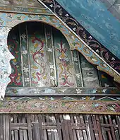Ninety-four motifs have been observed on rumah gadang. Thirty-seven of them refer to flora, such as kaluak paku ('fern tendrils'), saluak laka ('interwoven rattan'), pucuak rabuang ('bamboo shoots'), areca-nut palms,[1] and lumuik hanyuik ('washed-away moss'). Twenty-eight motifs refer to fauna, such as tupai tatagun ('startled squirrel'), itiak pulang patang ('ducks going home in the afternoon) which symbolizes co-operation and homecoming wanderers,[1] and kumbang janti (golden bumblebee). The remaining twenty-nine motifs refer to humans and sometimes their activities or behavior, such as rajo tigo (three kings of the realm), kambang manih (sweet flower, used to describe an amiable girl) and jalo takambang (casting a net).