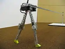 RunBot [1][2] is a miniature bipedal robot which belongs to the class of limit cycle walkers. Instead of using a central pattern generator it uses reflexes which generate the gait. The reflexes are triggered by ground contact sensors in the feet which then activate the motors. The generation of the walking gait is straightforward: when a foot touches the ground the other leg is lifted upwards so that the robot falls forward. This then causes this leg to touch the ground and so forth. The walking speed can be improved by means of reinforcement learning because there are only a few parameters in this scheme. RunBot was built in 2005 by Tao Geng as part of his PhD under supervision of Prof Woergoetter and after an idea by Dr Porr to use a walking robot to benchmark reflex based reinforcement learning rules. Its movements and adaptability are based on the work of neurophysiologist Nikolai Bernstein.[3]