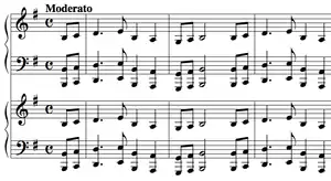 While still a student at Moscow Conservatory, Rachmaninoff wrote to Natalia Skalon on January 22, 1891 [O.S. January 10] mentioning that he had begun work on a piece for two pianos that he wanted to play with Alexander "Sasha" Siloti.[3] He dated the manuscript January 12–15, 1891 [O.S., implying that he had the composition in his head at the time of the letter, and only recorded the days he notated it on paper. Despite his stated intentions, he began rehearsing with Leonid Maximov, who had been a fellow student of Nikolai Zverev and pupil of Siloti, to play at a student concert at the Conservatory on March 8, 1891. However, Zverev, still upset over Rachmaninoff's request for a separate composing room, did not allow them to play together, so at the concert Rachmaninoff ended up conducting his choral work Deus Meus (1890) instead.[1] The Rhapsody received its first performance after he graduated, on October 29, 1891, played by Rachmaninoff and Josef Lhévinne at the Conservatory.[2]