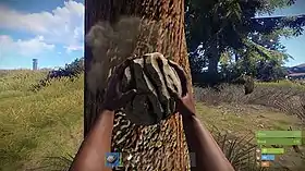 As a multiplayer-only video game,[3] Rust pits players against each other in a harsh, open world environment with the sole goal of survival. Animals, such as wolves and bears, act as a looming threat, but the primary danger comes from other players.[3] Most maps are procedurally generated,[4] with the exception of some pre-built maps.[5] Player vs player (PvP) combat is accomplished with bows, melee weapons and craftable guns.[6] Bullets and other projectiles travel in a ballistic trajectory, rather than being hitscan.[5][7] There are a number of different types of bullet for each gun, including high velocity and explosive,[8] thus allowing for more diverse strategy.[9] Hit tracking calculates damage;[5] shots to the head are more damaging than shots to other parts of the body.[10][11] The use of weapon attachments, such as holographic sights, provide an advantage over opponents.[12] To survive, the player must craft tools, build bases, and team with other players.[13]