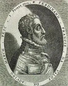 Ruy López Dávalos (Úbeda, Jaén Province, Spain, 1357 - in exile, Valencia, Spain, 1428), Count of Ribadeo since it was sold by the first count, the Frenchman Pierre de Villaines, who received it from Henry II of Castile on 20 December 1369, Adelantado of Murcia, 1396, Constable of Castile, 1400–1423, during the reigns of kings Henry III of Castile and John II of Castile. He was very attached to king Henry III's uncle, Ferdinand of Antequera, afterwards elected king Ferdinand I of Aragon, king 1412-1416. He was attached then to one of Ferdinand's troublesome sons, Infante Henry of Aragon (1400–1445).