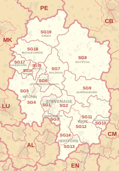 The SG postcode area, also known as the Stevenage postcode area,[2] is a group of nineteen postcode districts in England, within fifteen post towns. These cover north Hertfordshire (including Stevenage, Baldock, Buntingford, Hertford, Hitchin, Knebworth, Letchworth, Much Hadham, Royston and Ware) and east Bedfordshire (including Arlesey, Biggleswade, Henlow, Sandy and Shefford), plus a small part of south-west Cambridgeshire and a very small part of Essex.
