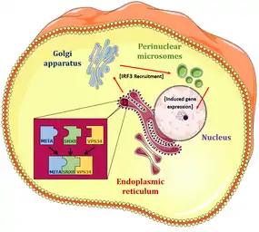 SNX8 is a key component in the induction of downstream effector antiviral gene transcription in response to DNA viruses , as it is necessary for MITA-mediated activation of the IFNβ promoter in a dose-dependent manner. It regulates the activation of MITA, a central adaptor protein in the innate immune response to DNA viral infections that activates and onsets the antiviral response, by allowing its association with the class III phosphatylinositol 3 kinase VPS34-containing translocon machinery to form the MITA-Vps34 translocation complex; this linkage is crucial for MITA transport from the ER to perinuclear microsomal punctuate structures, which are induced by infection of viruses such as HSV-1, via Golgi mediated intracellular traffic. This MITA transport pathway is vital for the immune response to start. SNX8 is suggested to play a role in MITA's activation through this transport pathway, modulating its phosphorylation at serine in position 366 and recruiting the transcription factor IRF3 whose activation is important in the activation of the IFNβ promoter transcription. This hypothesis is supported by the fact that MITA, SNX8 and VPS34 colocalize in the cytoplasm, and that SNX8 localization in ER, ER-Golgi intermediate compartment, Golgi and endosomes is similar to that of MITA. Examples of genes whose DNA virus-triggered expression is stimulated by SNX8 are IFNB1, ISG56, CXCL10 and IL6 (being IFNB1 and IL6 related to cytokine secretion).[10]