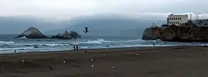In early morning hours of 8 October 1936, Ohioan ran aground near Seal Rock on the south shore of the Golden Gate, just outside San Francisco Bay. The ship, sailing in a dense fog, strayed too close to shore and grounded on the rocks,[1] sending a shower of sparks that lit up the night.[30] When the fog cleared later in the morning, the ship was firmly seated on the rocks at the base of a 250-foot (76 m) cliff, and some 300 feet (91 m) from the mainland. Coast Guardsmen on shore attached three lines to the ship and set up a breeches buoy to take off the harbor pilot, but the crew stayed on board the ship in hopes that the high tide would free her from the rocky perch. As word of the shipwreck spread, spectators clambered over the cliff to get a view of the scene; one man died from a heart attack and two women broke ankles in separate falls. Newsboys soon arrived on the scene, selling newspapers telling of Ohioan's woe within sight of the stranded ship. Policemen were called out to keep order as the crowd grew into the thousands.[1]