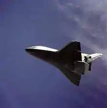 Although the STS-2 mission had been planned for a duration of five days, with a few hours a day spent testing the Canadarm, the flight was cut short when one of the three fuel cells that produced electricity and drinking water failed. The mission was shortened to two days, and the Canadarm tests were canceled. The crew stayed awake during a scheduled sleep period and tested the arm anyway, working during the Loss-Of-Signal (LOS) periods when they were not in contact with Mission Control.[11] The deorbit and reentry phase of this mission differed from STS-1, in that while the first shuttle entry was flown as a "middle of the road" test of the automatic guidance, the success of that mission allowed for the STS-2 crew to explore the stability margins of the vehicle's performance. Twenty-nine planned Programmed Test Inputs (PTIs) were manually flown in the Control Stick Steering (CSS) mode, with Engle making use of his past experience in the X-15. These PTIs provided useful data for subsequent engineering modifications.[11] Contrary to the interviewer's assertion in a JSC Oral history conversation with Engle, he hand flew manoeuvres throughout the entire entry speed range, but not for the entire duration.[12] As a consequence of STS-1 entry anomalies, the first roll manoeuvre was flown manually and the elevon scheduling was adjusted to offload the body flap.