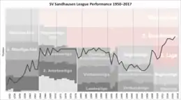 After a shaky start financially, the club advanced steadily through the lower leagues until it earned promotion to the Bezirksliga Rhein-Saar in 1931, but only played for a single season at that level before descending again. In 1943, it was merged with TSV Walldorf and VfB Wiesloch to form the wartime squad KSG Walldorf-Wiesloch. The combined squad was dissolved at the end of the conflict and SG Sandhausen was reestablished as an independent club late in 1945. A half dozen years later it re-claimed its original name. Sandhausen played football in the Landesliga or 2.Amateurliga until 1956 when it advanced to the 1.Amateurliga Nordbaden. In 1977, the team finished runner up in the German amateur championship and progressed to the Oberliga Baden-Württemberg in 1978 where it consistently earned finishes in the upper half of the table. Sandhausen claimed three Oberliga titles through the 1980s and the German Amateur Championship in 1993. It won back-to-back Oberliga titles in 1995 and 2000 and, with its latest title in 2007, gained promotion to the Regionalliga Süd (III).