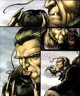 During the "Hunt for Wolverine" storyline, Sabretooth is seen at Chester's Bar where he, Daken, and Lady Deathstrike discuss Wolverine being sighted after returning from the dead. Sabretooth tells Daken that he will kill Wolverine and then kill Daken. The three of them follow his trail to Maybelle, Arizona.[84] Sabretooth and Lady Deathstrike continue searching Maybelle for Wolverine when they are attacked by zombies made from those at a birthday party. One of them bites Sabretooth as Lady Deathstrike gets him away from the zombies. Both of them wonder where the zombies came from. As they get to their car, it suddenly explodes. Sabretooth starts running and finds that his zombie bite is not healing. Sabretooth comes across more zombies as he starts killing them with Lady Deathstrike not far behind him. Both of them take refuge in a garage.[85] When Daken catches up to them, Lady Deathstrike and Sabretooth are informed of a glowing green device in the power station that has to do with the zombies and they must fight their way past the zombies to destroy it before Maybelle is burned to the ground. While fighting the zombies and soldiers from Soteira Killteam Nine, Sabretooth discovers that one of the soldiers is a zombified version of his dead son Graydon. After getting Daken away from the attackers after he was stabbed by the zombified version of Lord Dark Wind, Sabreooth defends Daken from his zombified son as there is 10 minutes left before Maybelle is burned to the ground.[86] Sabretooth continues his fight with his zombie son trying to get the information on how he was raised as a zombie until Lady Deathstrike stabs Graydon in the neck and states that the adamantium that they tracked was her father's adamantium. With six minutes left before Soteira burns Maybelle to the ground, Sabretooth and Lady Deathstrike destroy the glowing device. The next day, Sabretooth and Lady Deathstrike carjack someone outside a diner as Sabretooth suggests to Lady Deathstrike to have her Reaver friends get her a new hand. Lady Deathstrike tells Sabretooth to shut up and drive.[87] Sabretooth later relayed his discovery to Kitty Pryde as she mentions to Iron Man and Daredevil that he is trying to get some redemption.[88]