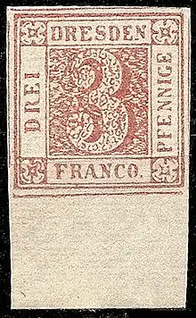 The Sachsen 3 Pfennige red, commonly called Sachsendreier, issued on 29 June 1850 and valid from 1 July 1850 until 31 December 1867, was the first postage stamp of the Kingdom of Saxony, making this country the second among the German States (after the Kingdom of Bavaria) to issue postage stamps.
