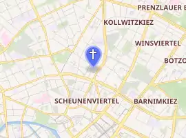 The Sacred Heart Church (German: Herz-Jesu-Kirche) is a Catholic church located in Berlin-Prenzlauer Berg, externally built in Neo-Romanesque style. Designed by Christoph Hehl, professor of medieval architecture, the building was completed after 16 months of constructions in 1898. The Neo-Byzantine-style murals inside the church were done by Friedrich Stummel.