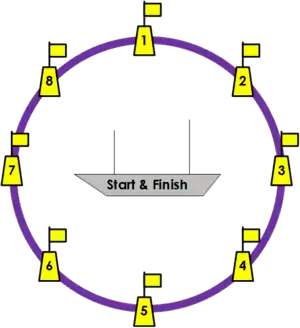 The sailing was done on the triangular type Olympic courses. The start was made in the center of a set of 8 numbered marks that were places in a circle. This made it possible to begin and finish every race sailing against the wind, regardless of the direction of the wind. During the starting procedure the sequence of the marks was communicated to the sailors. Starting upwind ensure a fair start of every race.[3] This mark system is, at least in certain German lakes, still in use in many places.