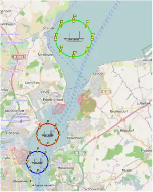 One race area was created to the East of Schilksee and two in the harbor area more into the Firth of Kiel. Near the course areas tribunes on barges and on land were placed for spectators.[3]