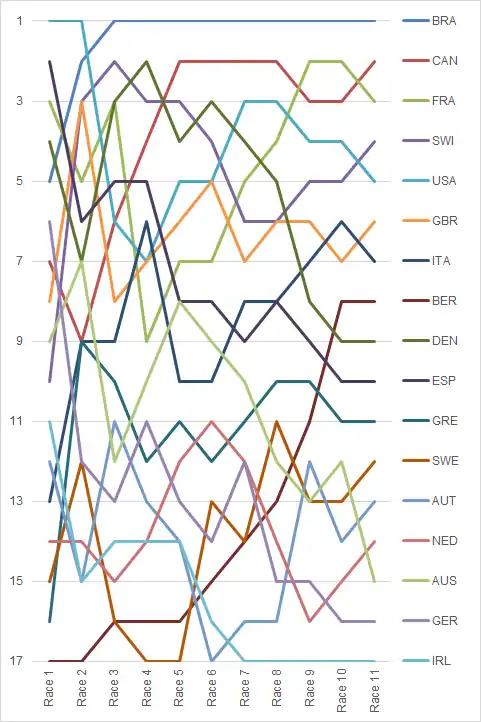 | Rank | Country | Helmsman | Crew | Race 1 | Race 2 | Race 3 | Race 4 | Race 5 | Race 6 | Race 7 | Race 8 | Race 9 | Race 10 | Race 11 | Total | Total – discard | |||||||||||