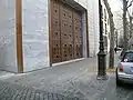 On its southern side, the church fronts directly onto the street. It is entirely clad in semi-translucent white marble. This striking material demarks the religious character of the building and sets it apart from its neighbours. At night, because of the marble's translucence, the church's interior lighting illuminates the street outside.