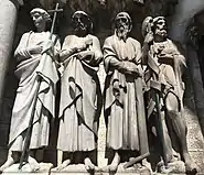 Burges' designs for the western façade were based on medieval French iconography. He considered this front to be the most important exterior feature as it would be lit by the setting sun and thus the most dramatic.[42] The theme is The Last Judgement, with representations of the twelve Apostles bearing instruments of their martyrdom, the Wise and the Foolish Virgins, the Resurrection of the Dead and the Beasts of The Evangelists.[43] The gilded copper "resurrection angel" facing eastwards on the main spire is locally the cathedral's most iconic feature, and colloquially known as the "goldie angel".[30] It was designed by Burges and erected in 1870 free of charge as his gift to the city, in recognition of Cork's willingness to fund his original design, and positioned in place of an intended wrought-iron cross.[39]