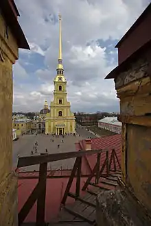 The cathedral is dedicated to Saints Peter and Paul, the patron saints of the fortress (Saint Peter being the patron saint of the city). The current cathedral is the second one on the site. The first, built soon after Peter's founding of the city, was consecrated by Archbishop Iov of Novgorod the Great in April 1704.