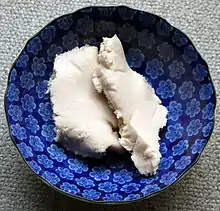 Sake kasu (酒粕) or sake lee is a cooking ingredient that is white in color with a paste-like texture.[1] The taste of sake kasu is fruity and has a similar taste to Japanese sake.[2] Sake kasu is the lees left over from sake production. It is a by-product of Japanese sake production that contains 8% of alcohol, high nutritious values and provides health benefits.[3][4] Sake Kasu can be used as a marinade base in different Japanese dishes such as fish, vegetables, and meat, enhancing the umami flavor of the dish.[1] Sake kasu can also be found in cosmetics and skincare products.[5] Sake kasu is considered as a part of the Japanese “no waste” culture since the waste of the sake production is used in various ways.[6] Mirin, a type of sweet Japanese sake can also produce kasu called mirin kasu.[4] Similar to sake kasu, mirin kasu can also be used as a healthy food ingredient.[7]