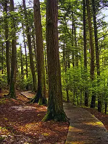 - Woodland Trail is a 0.25-mile (0.40 km) easy trail that is marked with blue blazes. It loops off Hemlock Trail through the old growth forest. Hikers will need to climb over or go around a 300-year-old hemlock that has fallen across the trail.[1]