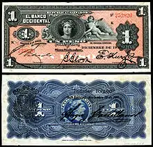 The government issued banknotes (engraved and printed by the National Bank Note Company of New York) denominated in pesos in 1877, in denominations of 1, 2, 5, 10, 25, 50, 100 and 500 pesos.[3] Following this, private banks issued notes until after the peso was replaced by the colón. These included the Banco Agricola Comercial, the Banco de Ahuachapam, the Banco de Centro America y Londres, the Banco Industrial del Salvador, the Banco Internacional del Salvador, the Banco Nacional del Salvador, the Banco Occidental and the Banco Salvadoreño. Notes were issued in denominations of 1, 2, 5, 10, 25, 50, 100 and 500 pesos.