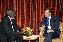 After serving 47 years as leader of SWAPO, he was succeeded by Hifikepunye Pohamba in 2007. There was speculation that he would be re-elected as SWAPO leader in 2007 and that he was planning to run for president again in 2009.[9] In early October 2007, however, Nujoma said that he had no intention of seeking re-election as SWAPO President and would stand aside in favour of Pohamba.[10][11] Pohamba was accordingly elected unopposed as SWAPO president on 29 November 2007 at a party congress. Nujoma said that he was "passing the torch and mantle of leadership to comrade Pohamba".[12] The congress also decided to give Nujoma the title of Leader of the Namibian Revolution, in addition to his existing title, Founding Father of the Namibian Nation.[13] Choosing to leave active politics, Nujoma was not re-elected to the SWAPO Central Committee nor the Politburo,[14] but the congress granted him permission to attend meetings of the Central Committee and Politburo "at his discretion". He may also receive the title of National Chairman of SWAPO.[13]