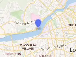 Sampas Pavilion is an outdoor amphitheater located in the Pawtucketville neighborhood of Lowell, Massachusetts along the Pawtucket Boulevard, 25 miles northwest of Boston, Massachusetts, United States and owned by the state of Massachusetts. The pavilion is located on the banks of the Merrimack River and is part of Lowell Heritage State Park. The seating capacity is approximately 1,000, consisting of general admission lawn seats and additional seating in the back. The venue has been in use since the early 1970s and has been used for events such as musical performances, ethnic festivals, and political rallies. The pavilion hosts a summer concert series, motorcycle rallies, and the city of Lowell's Fourth of July fireworks.