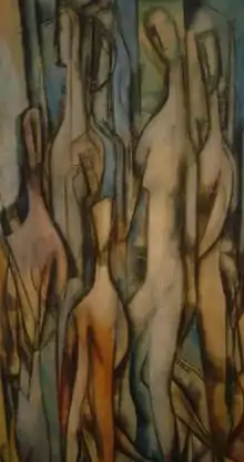 A review of a 1961 show at Monede Gallery, New York: "His mastery of drawing is apparent," Bookatz may have been a "newcomer to NY though by no means a beginner," "his paintings constitute a genuinely personal world and have modesty of conception and attitude."[10] "Particular to Bookatz is the frequent graceful rhythm which runs through the figures and, more basically, through one painting, since several heads are merely ovals which are repeated below to suggest spirals. The color is never diverse and often green, gray, or blue."[11]
