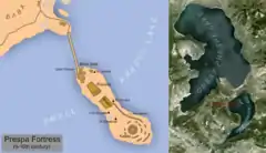 Prespa,[1] First Bulgarian Empire (unknown town located in the border-area of Prespa, shared between modern-day North Macedonia, Albania and Greece)
