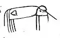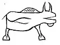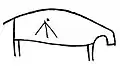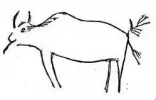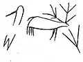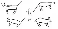 Some images on the walls were carved and some were painted. There were animals which Brown interpreted as bisons, lynx, rabbit, otter, badger, elk and heron. One panel showed a hunter and an elk. Another showed a hunter pointing a bow and arrow at a deer, with a child behind him. Another showed a human figure with a head-dress, which Brown interpreted as a chief. Other designs were indecipherable.[3]