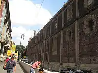 Although it no longer provides access inside the complex, the large facade that runs along almost the entire length of San Ildefonso Street is the original,[2] with a wide pedestrian zone between it and the street. The facade is a long wall which is covered in tezontle, a blood-red porous volcanic stone, with windows and doors arranged unevenly and pilasters dividing the façade horizontally.[1] These windows and doors are framed with jambs and lintels in cantera, a grayish-white stone.[4] Vertical pilasters made of chiluca, another kind of white stone, divide the facade, which has two levels with the lower one being larger. Most of the facade belongs to the Colegio Grande, or the original section of the College.[2]