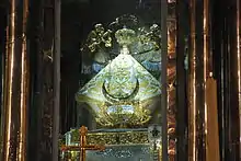 The pilgrims come to the city to pay homage to a small image of the Virgin Mary called Our Lady of San Juan de los Lagos, but sometimes referred to by her Nahuatl name of Cihuapilli, which means "Great Lady."[6] This image is very small, about 38 cm tall, made of sugar cane paste and believed to have been brought to the area from Michoacán in the early 1500s. The first important miracle ascribed to the image dates to 1623. A family of acrobats had a show which included “flying” over a field of spear points. The seven-year-old daughter fell onto the spears during the act and immediately died. Local women brought the image to the body and prayed over it when the child revived. This miracle made the image famous.[6] Since then, many other miracles have since been attributed to her intercession, often related to recuperation from mortal danger or dangerous illnesses.[7]