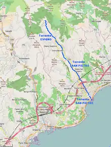 The creek is formed close to the village of Evigno (comune of Diano Arentino) from the union of several streams descending the south-eastern slopes of monte Torre (990 m).[2] Going SSW, a direction the creek wil keep till to its mouth, it reaches Diano San Pietro where it gets from the left rio Beste, its main tributary. San Pietro watercourse marks for a long stretch the border between the comuni of Diano Castello (West side) and Diano San Pietro. Not faraway from its mouth, which is located in comune of Diano Marina, the San Pietro is crossed by Genoa–Ventimiglia railway, Autostrada dei Fiori and State highway nr.1 (Via Aurelia).