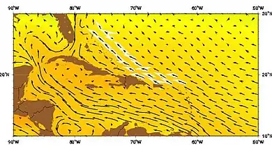 Wind and wave action in San Salvador is influenced by the Antilles Current. The Antilles Current originates south of the Bahamas, Puerto Rico, and Cuba and moves northward where it merges with the Gulf Stream.[23][24] This current cools the waters around San Salvador in the summer and warms the water around the island in the winter. This keeps the water temperature relatively mild and consistent throughout the year.[21]