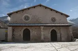 The Church of San Salvatore was built in the medieval period in a clearing along the via Nursina, a road which led from Spoleto to Norcia. It replaced an ancient Roman temple, which had been adapted as a church dedicated to Saint Mary upon the advent of Christianity. Some Roman remains were found in the church during restoration works in 1969.[1] The church was first mentioned in 1115, when it was documented as a dependency of the nearby Benedictine Abbey of Sant'Eutizio, as Plebs S. Marie de Cample cum earum pertinentiis et decimis et aliis pertinentiis or Plebania S. M. de Camplo. The Benedictine monks who administered the church were responsible for the decoration of the building using taxes raised from the faithful.