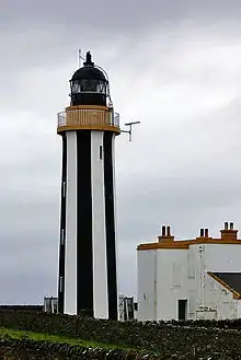 Start Point lighthouse on Sanday was completed on 2 October 1806 by engineer Thomas Smith (engineer). It was the first Scottish lighthouse to have a clockwork-driven revolving parabolic reflector creating a sweeping beam. The reflector was later replaced by a Fresnel lens. In 1870 the lighthouse was rebuilt. Since 1915, it has been painted by distinctive black and white vertical stripes which are unique in Scotland. The light was automated in 1962 and is powered by a bank of 36 solar panels.[37]
