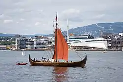 Sandefjord has been inhabited for thousands of years.[20] Excavations indicate that people have inhabited Sandefjord for around 3,000 years. Rock carvings at Haugen farm by Istrehågan in Jåberg are dated to 1,500–500 BCE.[29] Haugen farm is home to Vestfold County's largest petroglyph site.[30] The Vikings lived in Sandefjord and surrounding areas about 1,000 years ago, and numerous Viking artifacts and monuments can be found in Sandefjord.[31] One of the most important remains from the Viking Age was found at the grave site Gokstadhaugen (Gokstad Mound) in Sandefjord. The Gokstad ship was excavated by Nicolay Nicolaysen and is now in the Viking Ship Museum in Oslo. The Viking, an exact replica of the Gokstad ship, crossed the Atlantic Ocean from Bergen to be exhibited at the World's Columbian Exposition in Chicago in 1893. A replica of the Gokstad ship, called Gaia, currently has Sandefjord as home port.[32][29] Other known replicas include the Munin, (a half scale replica) located in Vancouver, Canada.