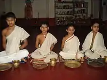 Sandhyavandanam (Sanskrit: संध्यावन्दनम्, sandhyāvandanam, lit. 'salutation to (Goddess) Sandhyā' or 'salutation during the time of Sandhyā') is a mandatory religious ritual supposed to be daily performed, traditionally, by Dvija communities of Hindus,[1][2] particularly those initiated through the sacred thread ceremony referred to as the Upanayanam and instructed in its execution by a Guru, in this case one qualified to teach Vedic ritual.[2] Sandhyopasana is considered as a path to attain salvation (moksha).