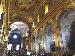 The church has a single-aisle Latin cross interior covered by a barrel vault with five chapels on either side. The Roman Mannerist painter, Luigi Garzi, painted the large picture on the counterfacade. He also painted the triangles above the arches of the chapels, the corbels of the dome, and the great vault of the nave. The dome was painted by Paolo de Matteis. The ceilings of the chapels have frescoes by Guglielmo Borremans; the choir decorations and painting were by Gaetano Brandi.[2]
