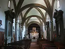 The church contain a canvas of the Madonna and Child with Angelic Musicians by the early 15th-century painter Alvaro Pirez di Evora.[4] On the lateral altars are paintings St Francis and a Child and Angel and Madonna(1649) by Jacopo Vignali. Other works are a Blessed Salvatore da Orta Franciscan cures the ill and sick (circa 1606) by Paolo Guidotti and a St Francis prays before the Apparition of Christ and the Madonna (after 1627) by Francesco Curradi. It holds a wooden crucifix from the 15th-century.