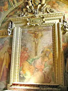 The first chapel on the right has frescoes of Scenes of the Passion (1556) by Taddeo Zuccari. The second chapel on has a Madonna with Child and Saints (1575) by Livio Agresti. The third chapel on the right has a Story of Jesus and Virgin by Giovanni Baglione. The chapel to the right of the presbytery has an icon of the Virgin from the 13th century. The altar, designed by Martino Longhi, has a fresco copy of the 14th century Madonna della Consolazione, repainted by Antoniazzo Romano. The walls of the presbytery are frescoed with a Nativity and an Assumption by Niccolò Circignani (il Pomarancio), who also painted the Scenes of the Life of Mary and Jesus in the fifth chapel. The 4th chapel to the left has frescoes on the Life of St. Andrew by Marzio Colantonio Ganassini. In the 3rd chapel on the left, are frescoes of scenes from the Life of the Virgin by Francesco Nappi; the 2nd chapel on the left has a St Francis receives the Stigmata of the 17th century; the 1st chapel has a Mystical Marriage of St Catherine (c. 1530), and a marble relief by Raffaello da Montelupo.