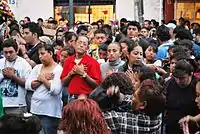 The phenomenon is based among people with scarce resources, excluded from the formal market economy, as well as the judicial and educational systems, primarily in the inner cities and the very rural areas.[17] Devotion to Santa Muerte is what anthropologists call a "cult of crisis". Devotion to the image peaks during economic and social hardships, which tend to affect the working classes more. Santa Muerte tends to attract those in extremely difficult or hopeless situations but also appeals to smaller sectors of middle class professionals and even the affluent.[7][31] Some of her most devoted followers are those who commit petty economic crimes, often committed out of desperation, such as prostitutes, and petty thieves.[17]