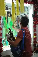 Devotees may present her with a polychrome seven-color candle, which Chesnut believed was probably adopted from the seven powers candle of Santería, a syncretic faith brought to Mexico by Cuban migrants.[34] Here the seven colors are gold, silver, copper, blue, purple, red, and green.[17][6] In addition to the candles and vestments, each devotee adorns their own image in their own way, using U.S. dollars, gold coins, jewelry, and other items.[8]