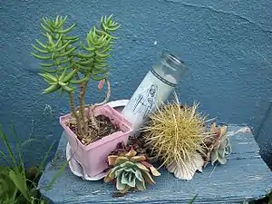 Shrines can also be found in the back of all kinds of stores and gas stations. As veneration of Santa Muerte becomes more accepted, stores specializing in religious articles, such as botánicas, are carrying more and more paraphernalia related to the cult. Historian R. Andrew Chesnut has discovered that many botanicas in both Mexico and the U.S. are kept in business by sales of Santa Muerte paraphernalia, with numerous shops earning up to half of their profits on Santa Muerte items.[27] This is true even of stores in very well known locations such as Pasaje Catedral behind the Mexico City Cathedral, which is mostly dedicated to stores selling Catholic liturgical items. Her image is a staple in esoterica shops.[8]