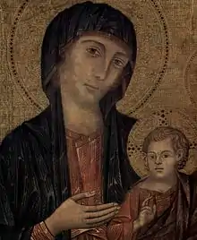 The Santa Trinita Maestà (Italian: Maestà di Santa Trinita) is a panel painting by the Italian medieval artist Cimabue, dating to c. 1290–1300. Originally painted for the church of Santa Trinita, Florence, where it remained until 1471, it is now housed in the Uffizi Gallery of Florence, Italy. It represents the Madonna enthroned with the Baby Jesus and surrounded by eight angels and, below, four half portraits of prophets.