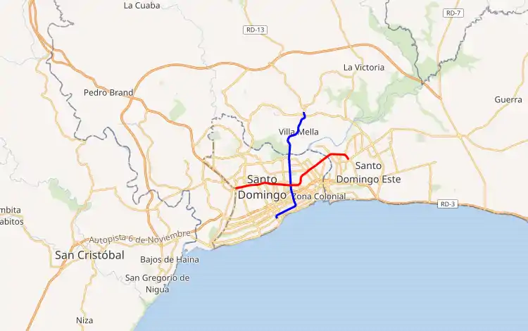Line 1[2] 14.5 km (9.0 mi)[2] Villa Mella to Centro de los Héroes 16 stations[2] |