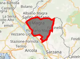 Santo Stefano di Magra (Ligurian: San Steva, Lunigiano Emilian: Sa' Steu[3]) is a comune (municipality) in the Province of La Spezia in the Italian region Liguria, located about 80 kilometres (50 mi) southeast of Genoa and about 11 kilometres (7 mi) northeast of La Spezia. It is located near the confluence of torrent Vara into the Magra river. It is part of the Montemarcello-Magra Natural Regional Park. It has an entrance and exit to the toll-paying "Autostrada"