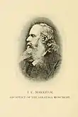 The monument was designed by John C. Markham of New Jersey. The capstone was placed on 3 November 1882, and the bronze statues were completed in August 1887.[1] The statues were designed by George Bissell (Gates), Alexander Doyle (Schuyler), and William O'Donovan (Morgan).[6][7] Markham designed the sixteen bronze bas-relief plaques that line the interior of the first floor.[8]