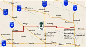 Saskatchewan Highway 711 connects Saskatchewan Highway 35 in the Wellington rural municipality (RM) to Saskatchewan Highway 9 in the Wawken RM. The beginning terminus is just south of Cedoux. The length of Highway 711 is 142.1 kilometres (88.3 mi) and it extends westward, in the south-eastern area of Saskatchewan northeast of Weyburn. Osage and Corning are the only communities along the route.[1]