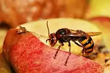 The larvae have several anti-predator adaptations. While adults are unable to sting, the larvae of species such as the spitfire sawfly regurgitate a distasteful irritating liquid, which makes predators such as ants avoid the larvae.[5][58] In some species, the larvae cluster together, reducing their chances of being killed, and in some cases form together with their heads pointing outwards or tap their abdomens up and down.[50][59] Some adults bear black and yellow markings that mimic wasps.[31]