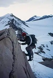 Dilly and Lane unhitched from their pulks and ran back. Dilly climbed down 20 feet but could see no sign of either of the fallen climbers. Dilly climbed back and they returned to collect more equipment from their pulks. Returning to the crevasse Dilly weighted a rope with a piton hammer and lowered the end down the crevasse. Dilly then abseiled down the rope and on reaching the end found himself within 20 feet of Lewis. Traversing to Lewis he cut him free from his pulk and carried him to a more secure position on a narrow ledge where he wrapped a tent around him.